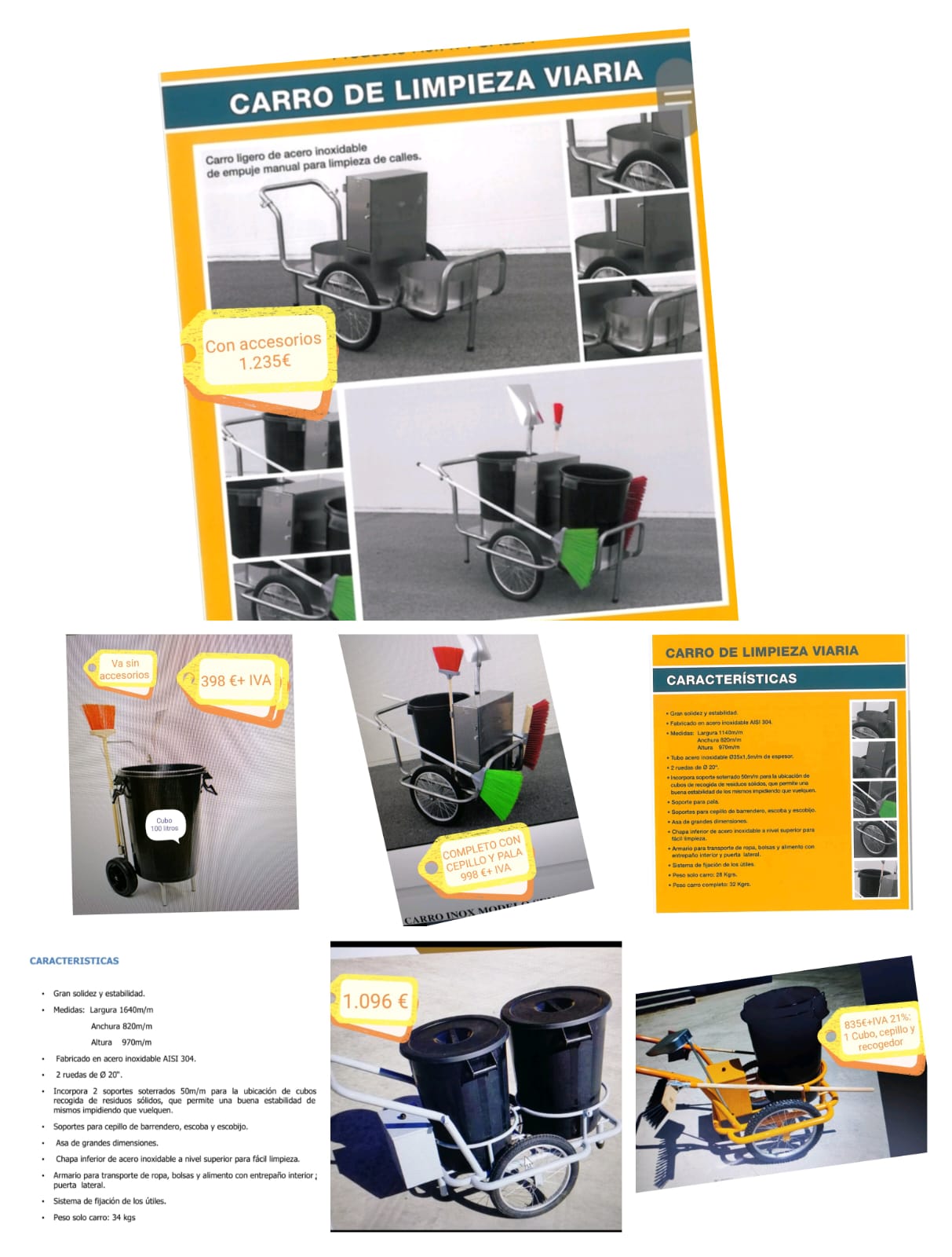 Carro de barrendero de acero inoxidable para labores de limpieza en exterior.