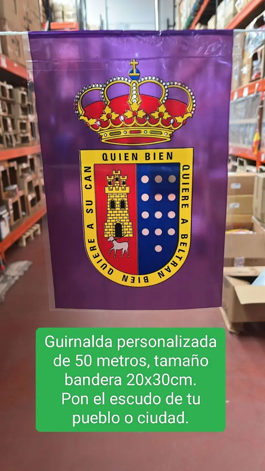 Guirnaldas personalizadas con el escudo de tu pueblo, pedido mínimo 125 bolsas de 50m. Precio 17€ + IVA la guirnalda